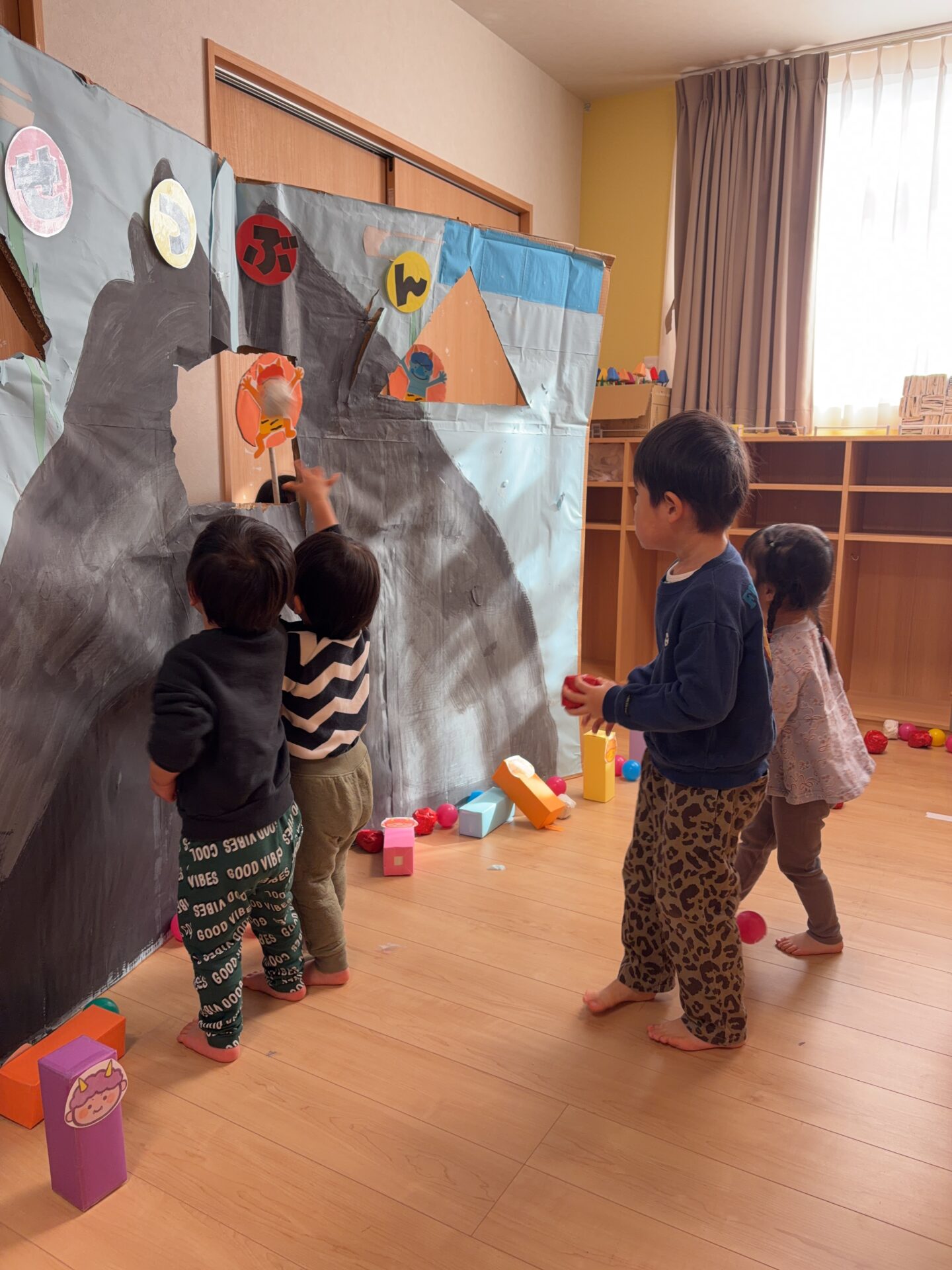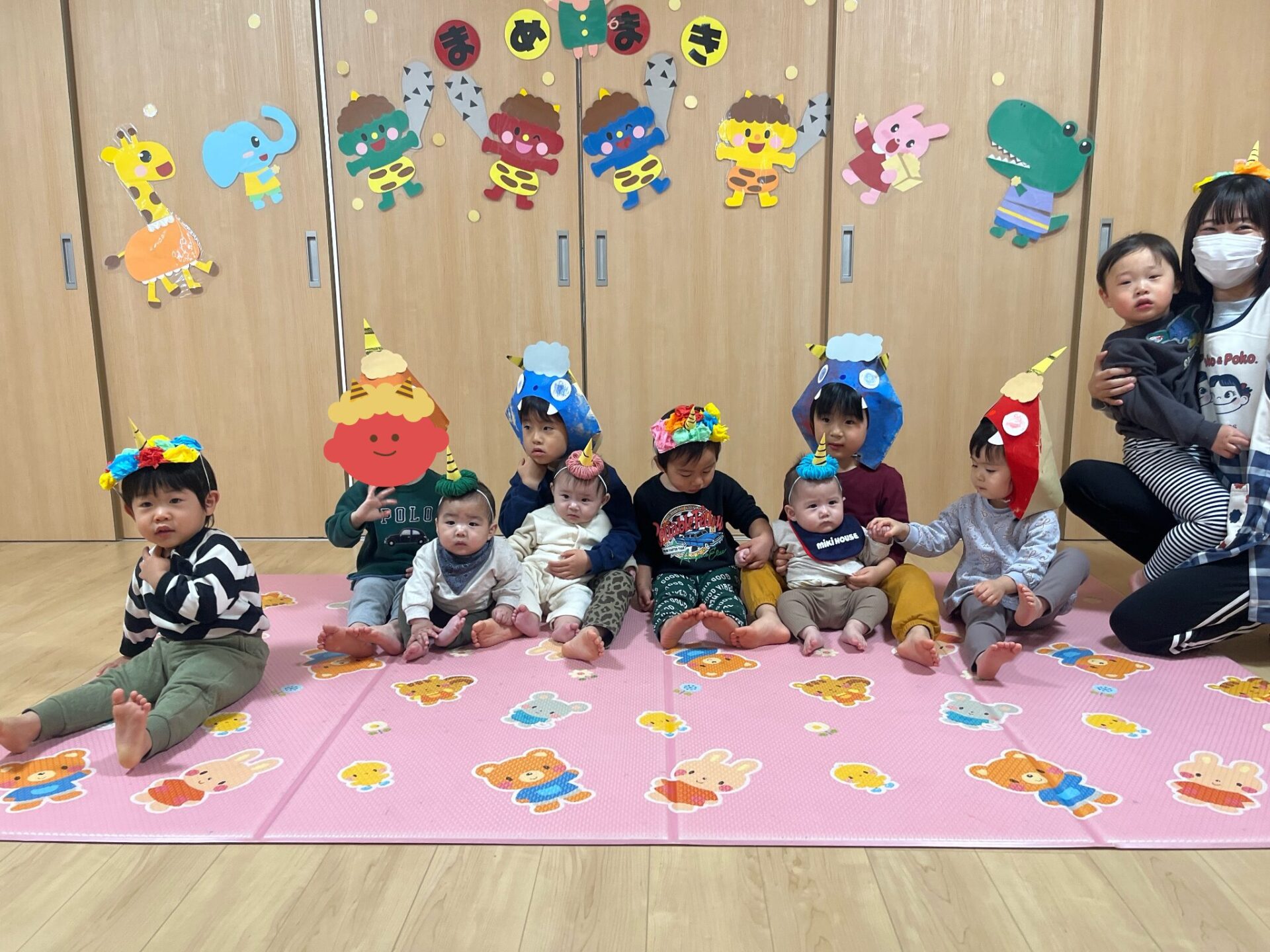 節分の豆まき会を行いました。 自分で作った鬼のお面をかぶり、 嬉しそうな子供たちでした。 今年は鬼は来なかったので壁面から出てくる 鬼のプレートにボールをなげて楽しみました。 ボールが当たると、「当たったよ!!」と 嬉しそうな子供たちでした。